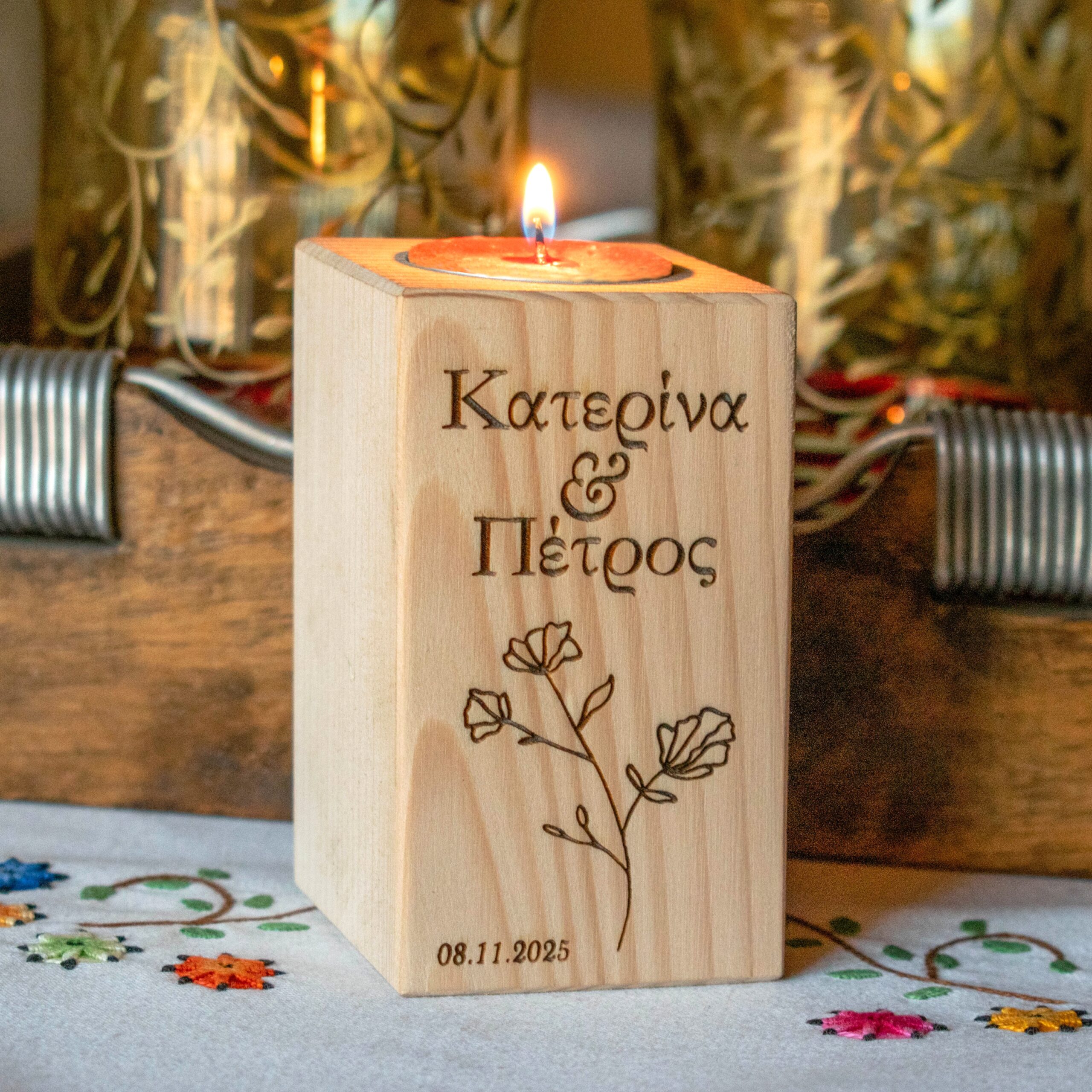 Χειροποίητη από μασίφ πεύκο, αυτή η ξύλινη βάση για κεράκια ρεσό φέρνει τη ζεστασιά του ξύλου και το απαλό φως της φλόγας στο πιο προσωπικό σας μήνυμα — ονόματα, ημερομηνία ή μια μικρή φράση που έχει σημασία.