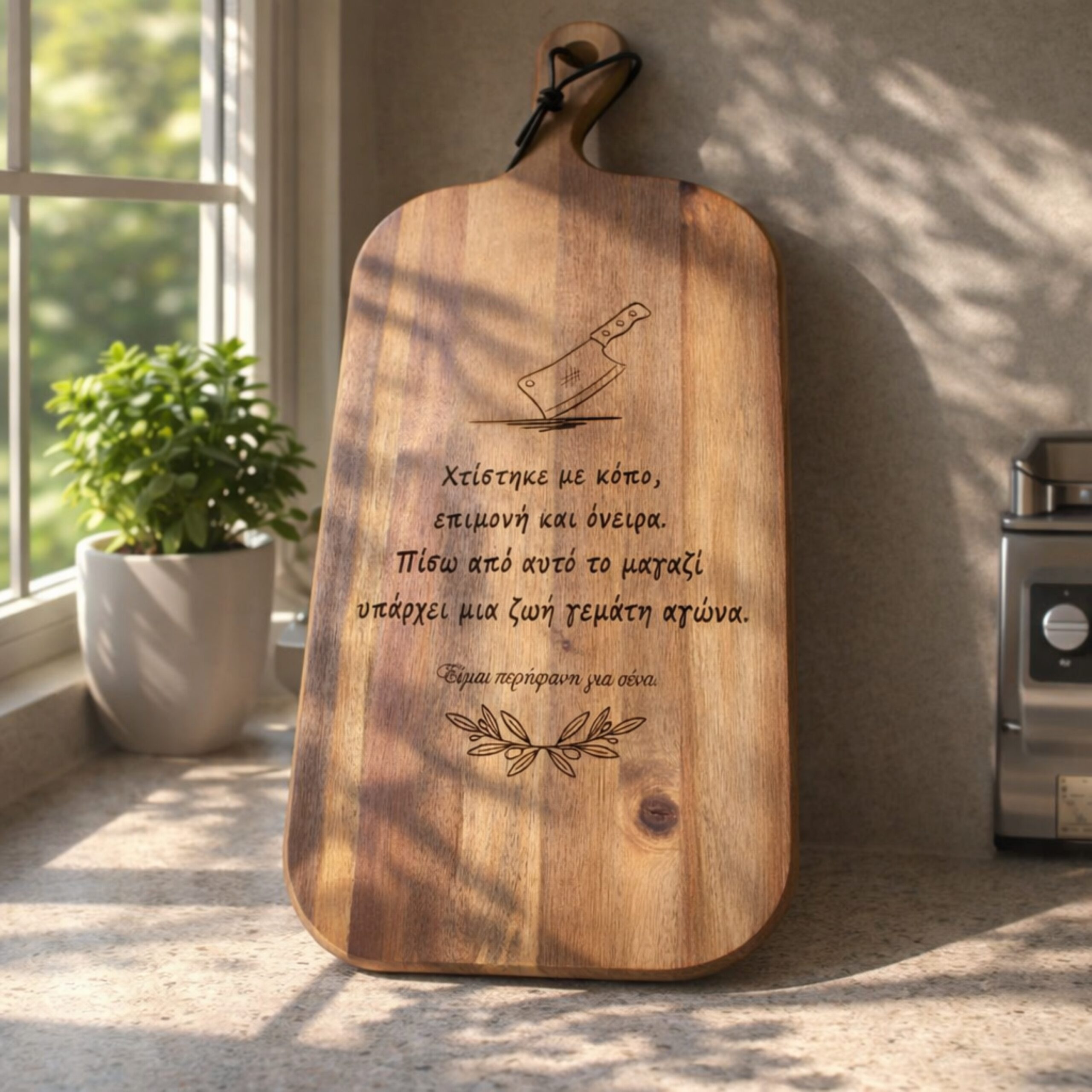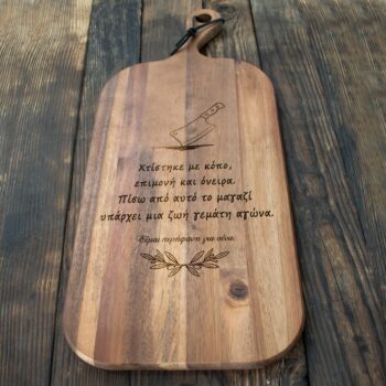Αυτό το ξύλο κοπής δεν είναι απλά ένα χρηστικό αντικείμενο για τον πάγκο της κουζίνας – είναι ένα έργο τέχνης με συναισθηματική αξία. Με την ποιοτική χάραξη που επιθυμείτε, μετατρέπεται σε ένα προσωπικό ενθύμιο που δηλώνει την αγάπη και τη φροντίδα σας με τον πιο όμορφο τρόπο.