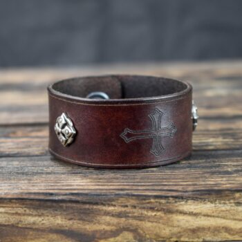 Το βραχιόλι που σας προτείνουμε εδώ είναι ιδιαίτερο και ξεχωριστό, φτιαγμένο από πλακέ δέρμα 3cm με χαραγμένο σταυρό, δύο διακοσμητικά κόντσος από μέταλλο και μεταλλικό κούμπωμα, ενώ μπορείτε να το φορέσετε πολύ εύκολα και είναι πολύ άνετο στο χέρι. Είναι φτιαγμένο από αυθεντικό veg tanned δέρμα.